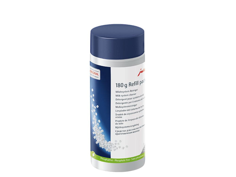 JURAn fine foam-teknologian ansiosta voit nauttia latte macchiaton, cappuccinon, macchiaton ja flat whiten kaltaisista erikoiskahvijuomista, joiden laatu on erinomainen. Jotta tämä olisi jatkossakin mahdollista, olemme kehittäneet maitojärjestelmän puhdistusaineen, joka on saatavilla minitablettien muodossa. Yhdessä automaattisen puhdistusohjelman kanssa tabletit poistavat tehokkaasti maidon rasvat ja proteiinit. Tällä putket pidetään puhtaina ja hygieenisinä, jotta voidaan valmistaa maitovaahtoa, joka on jatkuvasti hienoa ja höyhenenkevyttä.