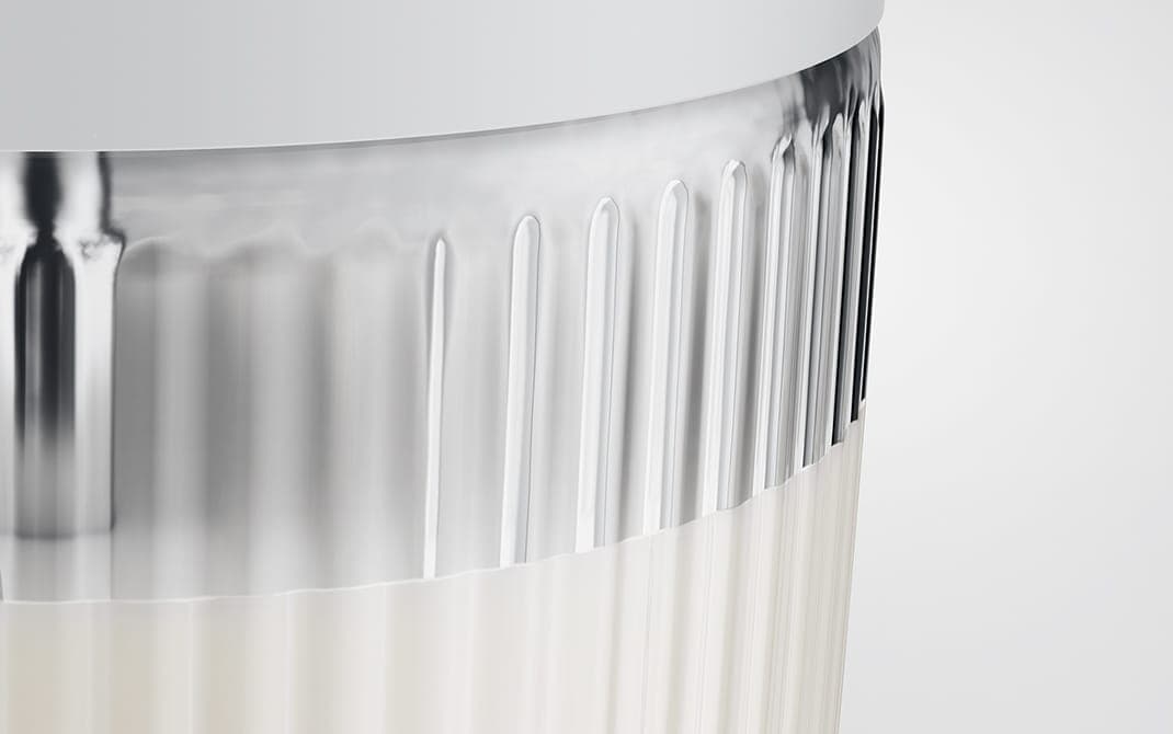Borosilikaattilasista valmistettu maitokarahvi kestää lämpötilan vaihteluita ja naarmuja. Sen voi puhdistaa hygieenisesti astianpesukoneessa, ja se suojaa maitoa ja kasvijuomia hajuilta ja pitää ne tuoreina. Paksun pohjan ansiosta karahvi on vakaa ja tukeva, ja uurrettu pintarakenne tekee siitä erityisen tyylikkään.